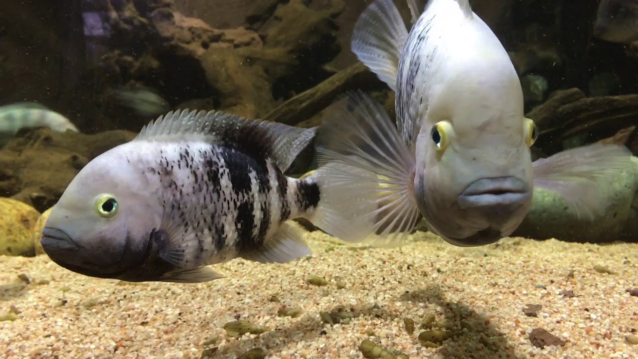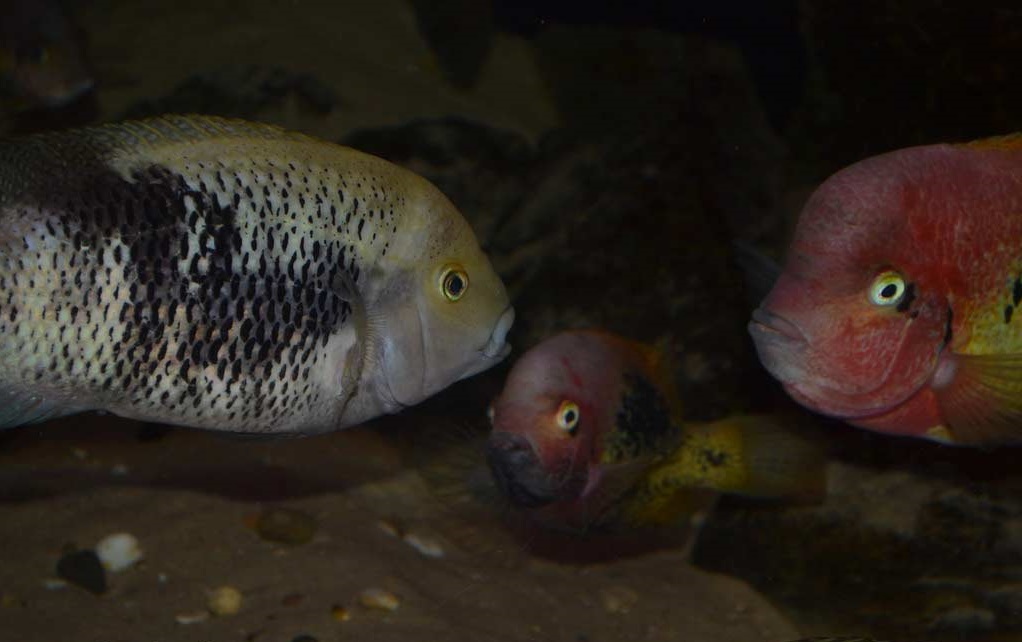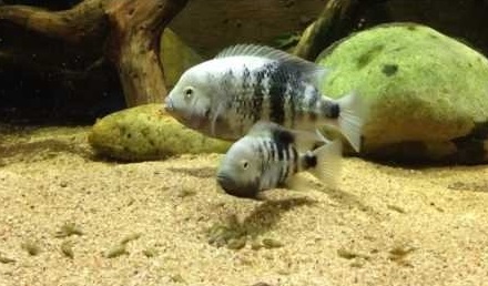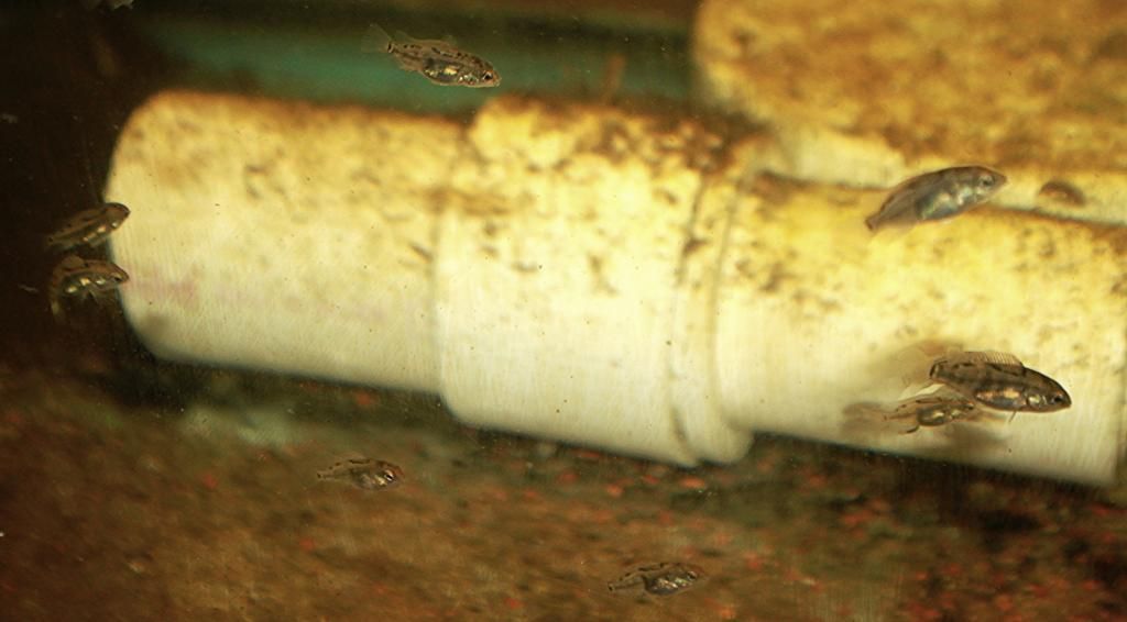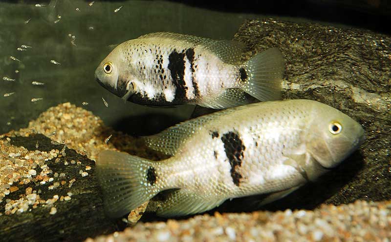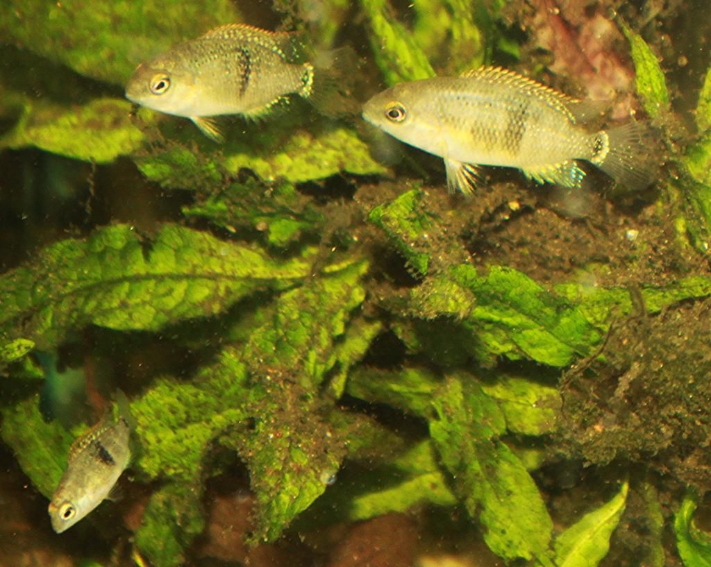Les jeunes alevins, aussi indisciplinés que n’importe quels autres alevins de cichlidés, errent sous la garde des parents dans l’aquarium, à la recherche constante de nourriture.