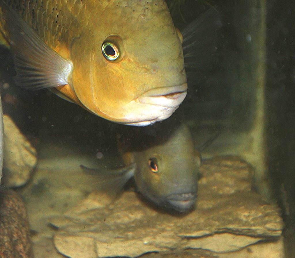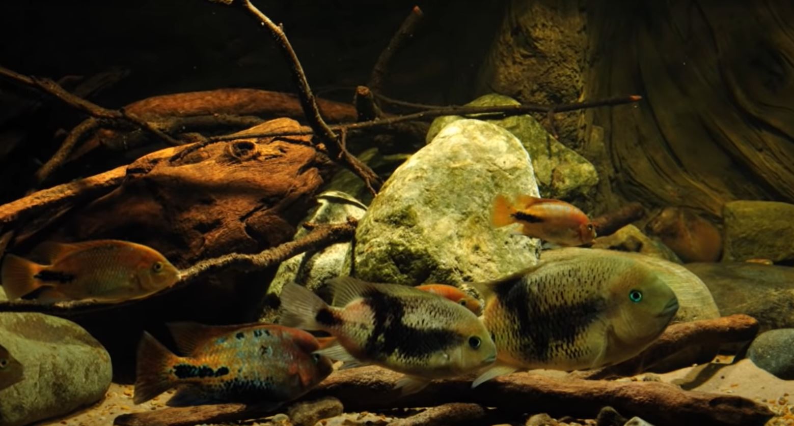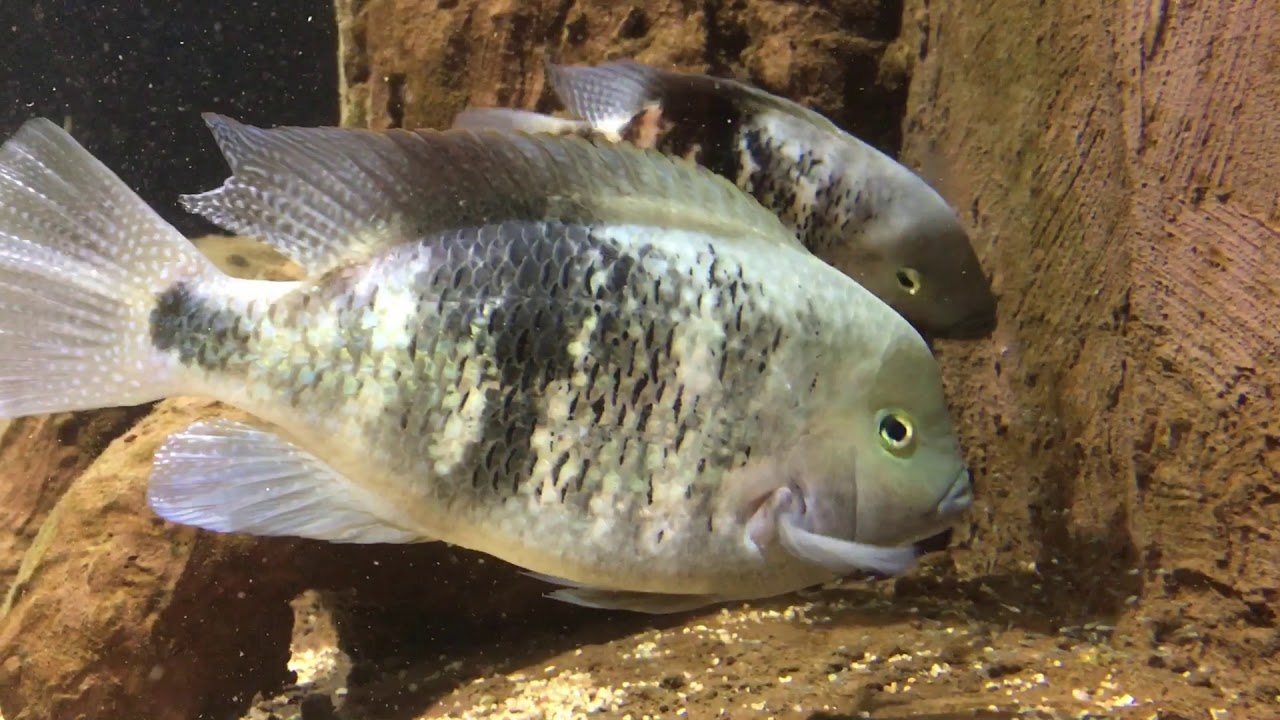 Les jeunes alevins, aussi indisciplinés que n’importe quels autres alevins de cichlidés, errent sous la garde des parents dans l’aquarium, à la recherche constante de nourriture.
