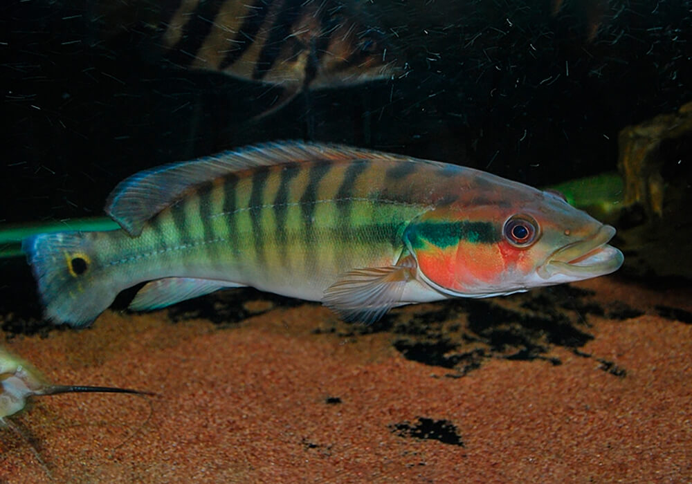 Chez l’adulte Crenicichla cincta, la bande longitudinale est réduite à la zone située entre l’œil et la couverture des branchies.