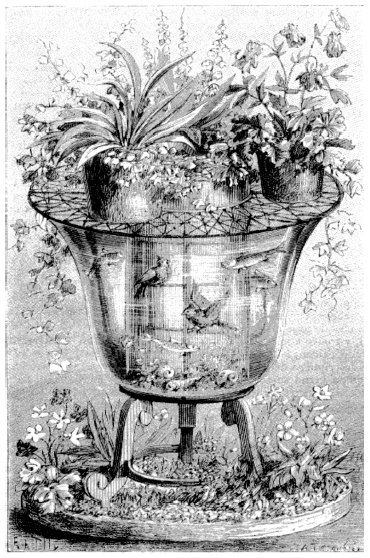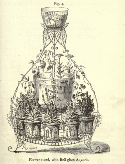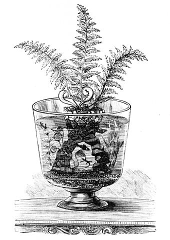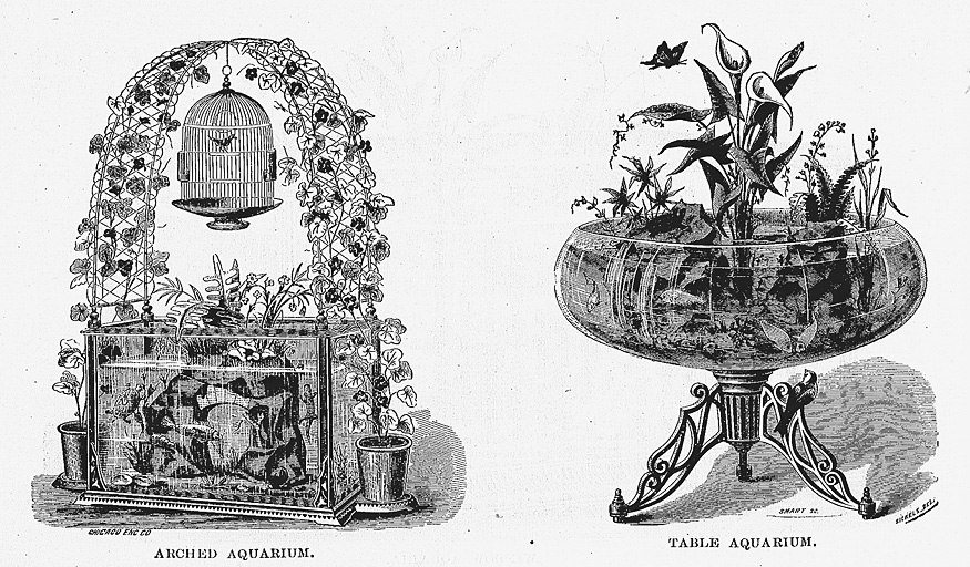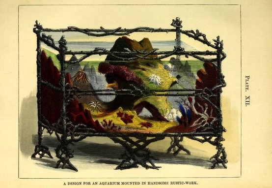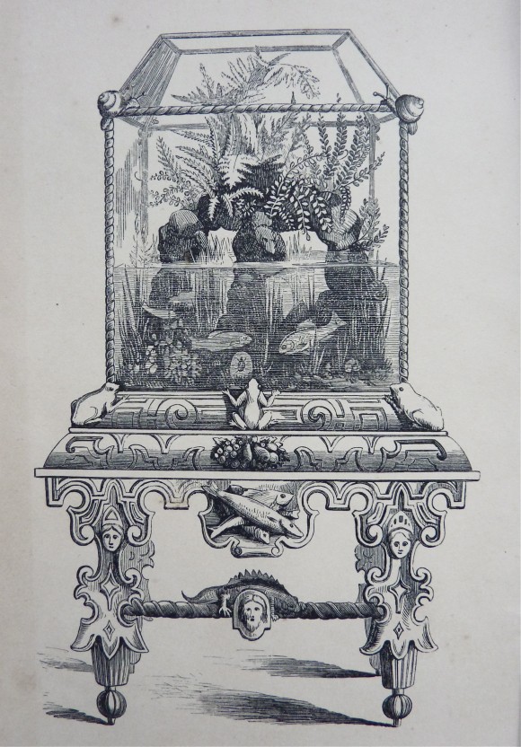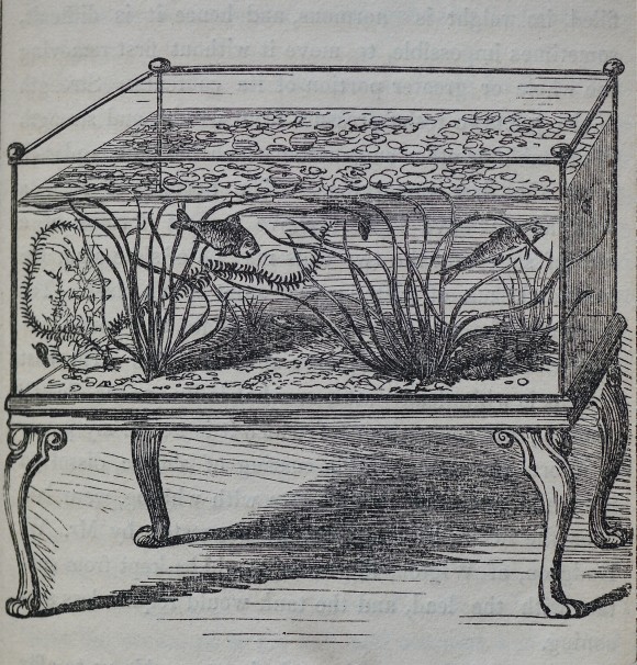 « Ceci est l’aquarium, constitué d’un réservoir en verre ou d’une fontaine, généralement de forme oblongue, avec des côtés droits, et d’une taille plus grande ou plus petite, mais cependant de dimensions suffisantes pour admettre un plancher de sable et de pierres, avec quelques les plantes aquatiques, de sorte que les poissons de toutes sortes puissent librement se déplacer dans l’eau au-dessus et au-dessous de ces objets. »