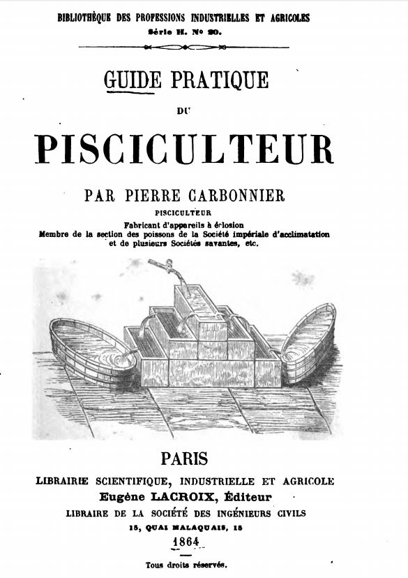 En ce qui concerne l’élevage des poissons, les Anciens et même les Modernes ne connurent en Europe jusqu’au XIXème siècle inclusivement, que les viviers et les étangs dont les pensionnaires étaient destinés à être mangés.