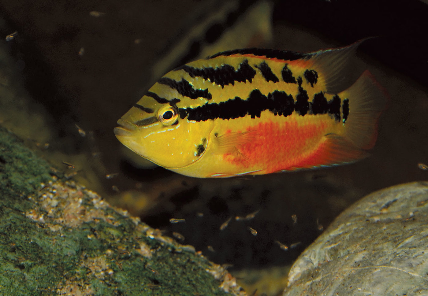 Trichromis salvini, le Cichlidé à ventre jaune, est originaire des bassins versants de l’Atlantique au Mexique et en Amérique centrale.