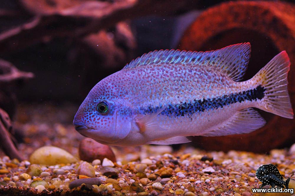 Il se distingue du reste de ses des congénères Vieja par une bande longitudinale foncée complète qu’il court depuis la région operculaire jusqu’à la base de l’aileron débit, formant une tache.