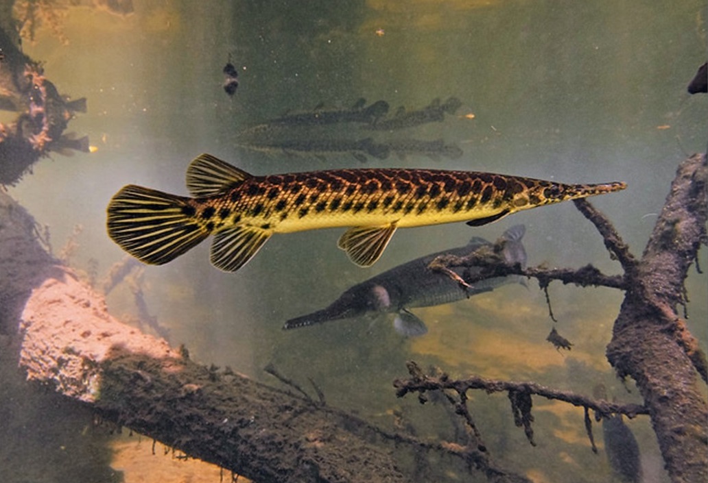 Le Lépisosteus tacheté atteint une longueur de 3 pieds (0,9 m) et pèse 3,6 kg (8 lb).